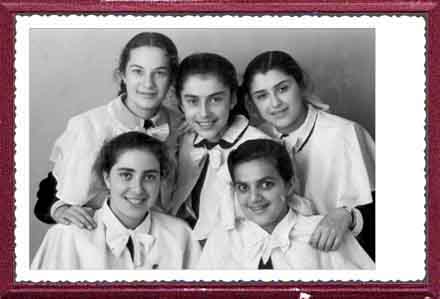 1952 год, Тбилиси. Мои школьные подруги. Слева направо в нижнем ряду - Кнарик Вартанова и Жанна Шакарян; в верхнем ряду - Женя Дмитриева, я и Инга Габриелян.